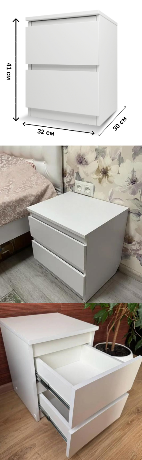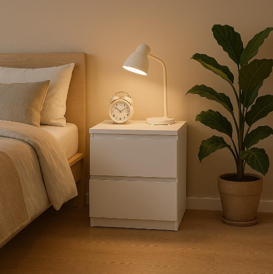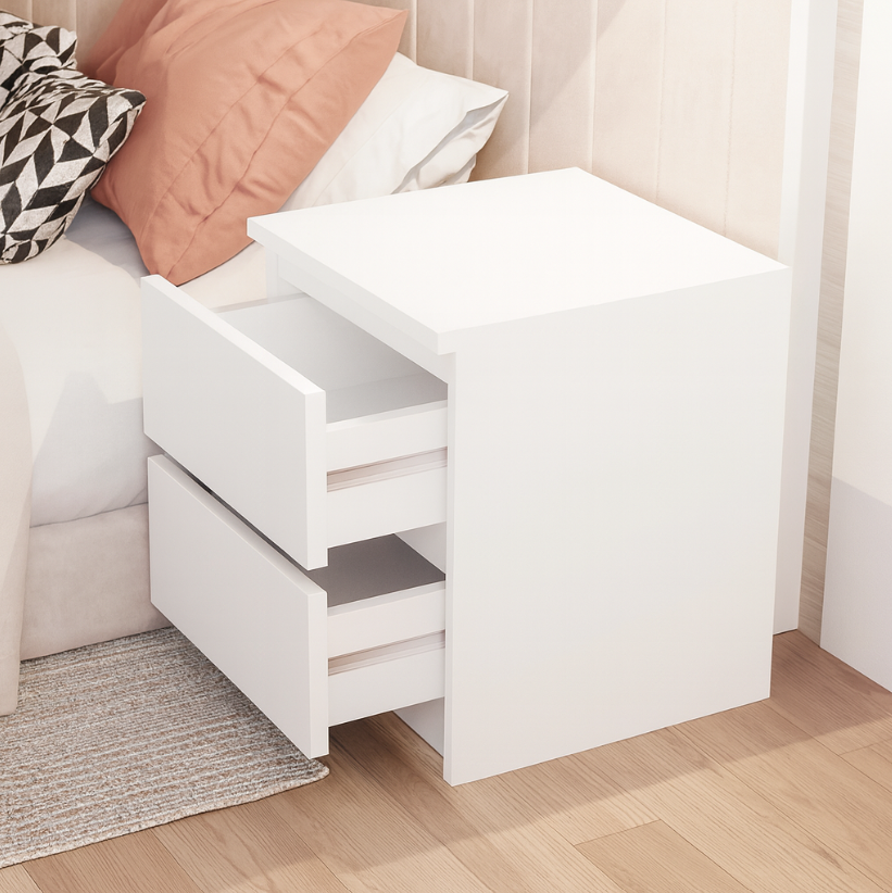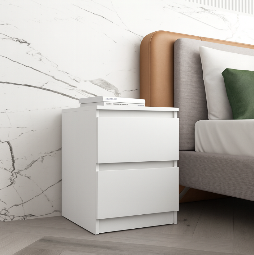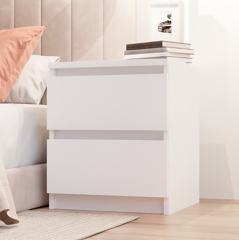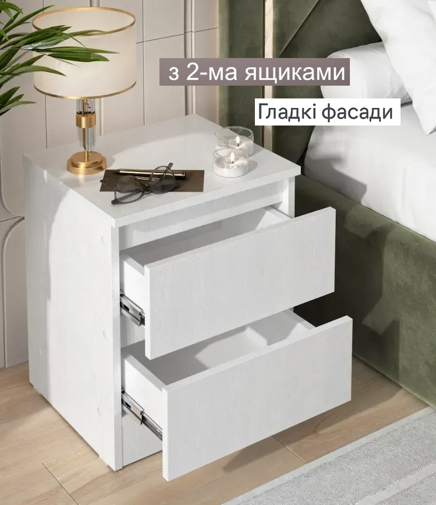 Дві місткі шухляди дозволяють зручно зберігати книги, гаджети, аксесуари та інші необхідні речі поруч із ліжком. Компактні розміри роблять тумбу ідеальною навіть для невеликих приміщень — спальні, дитячої або гостьової кімнати.